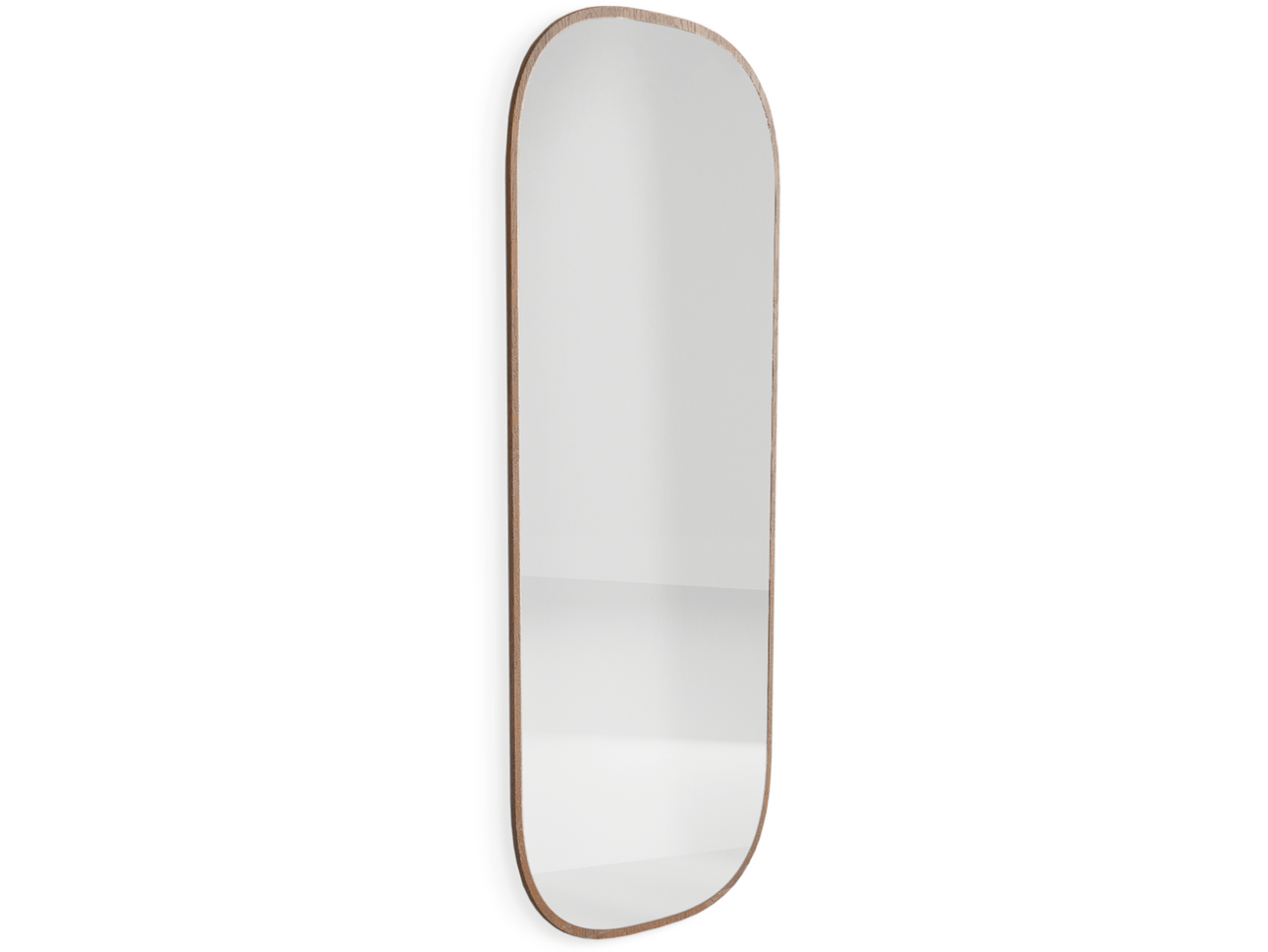 Стильное зеркало гармонично дополнит современный интерьер спальни, гостиной или коридора. Аккуратная рама, обрамляющая зеркало, полностью изготовлена из массива дуба, что делает конструкцию прочной и долговечной. При этом край рамы остаётся утончённым и лаконичным. Натуральные матовые оттенки дуба и округлые формы наполняют пространство красотой природы.