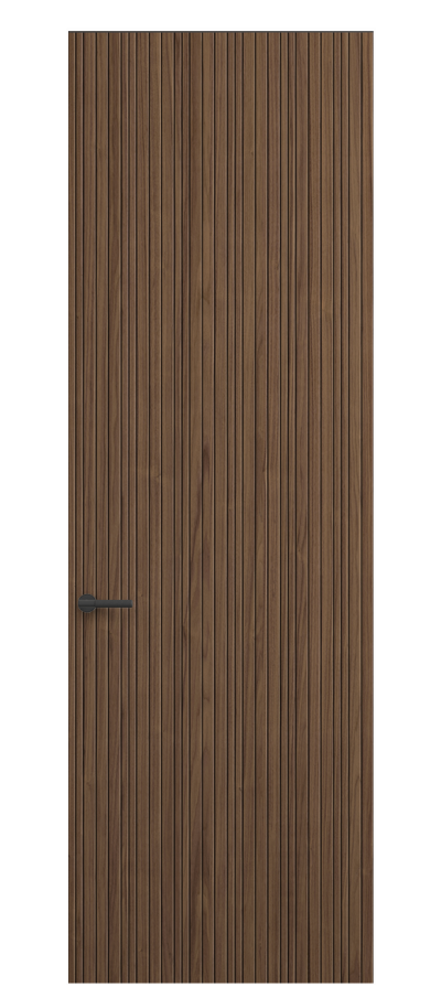 Селект — коллекция минималистичных дверей с фрезеровкой по натуральному шпону. Рельеф на поверхности полотна создаёт игру света и тени, добавляя пространству динамичности и визуального объёма. Двери Селект в сочетании со стеновыми панелями и мебельными фасадами, повторяющими лаконичный дизайн, создают единое стилевое решение.